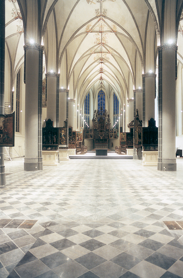 Dieses war für das vorhandene Kunstgut sehr schädlich. Es wurde in Abstimmung mit der Denkmalpflege ein Heizsystem mit 13 Boden-Wärmestationen (Mahrcalor-System) gewählt. Hierdurch wird eine gleichmäßig verteilte Wärme mit einer minimalen Luftgeschwindkeit erreicht. Die Lage der Wärmestationen wurde im Hinblick auf das Kunstgut und den neuen Altarstandorte mit der Denkmalpflege abgestimmt. Da durch den Einbau der Wärmestation und den hinführenden Leitungen der Eingriff in den Boden unumgänglich war, wurde die Bodendenkmalpflege hinzugezogen und sämtliche Arbeiten durch einen Archäologen überwacht.