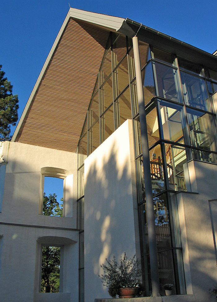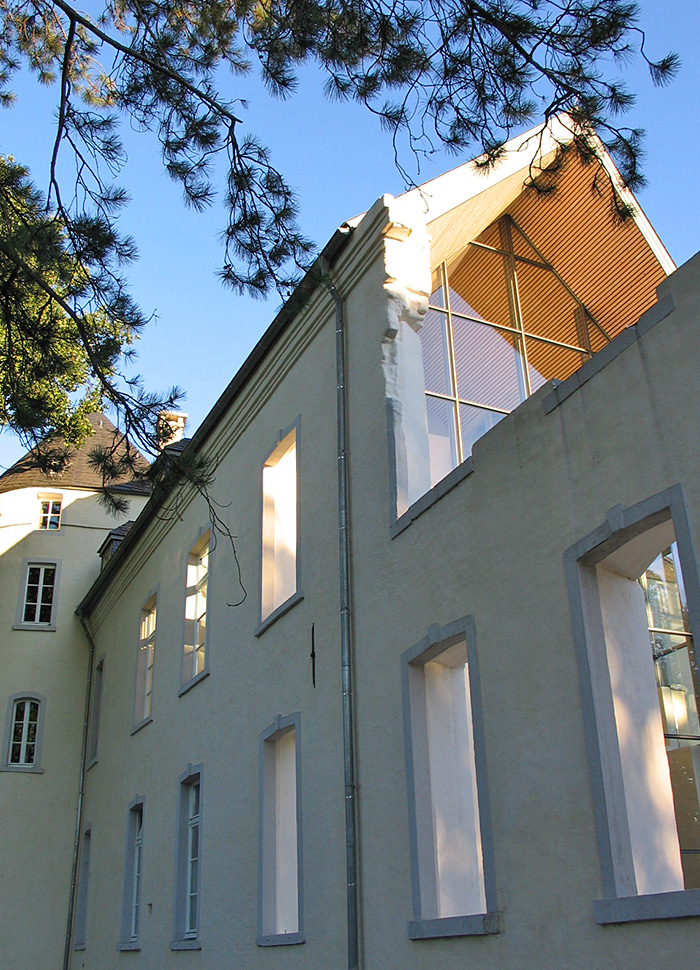 Architektonisch abzulesen ist dies an den neuen Einbauten bzw. Ergänzungen in die historisch repräsentative Hülle der Burg. Die Glasfassade im Foyer und die großzügig gestaltete Galerie im Dachgeschoss sind hierbei besonders zu nenne. Der Charakter der Burg als öffentlichkeits offene Gestalt wird durch diese Gebäudeteile innen und außen erkennbar. Sie bilden eine Schicht aus Architekturelementen hinter der bestehenden Backsteinfassade der Burg. Durch die asymmetrisch eingefügte Foyerverglasung wird eine „freie Mitte“ in Form einer großen lichtdurchfluteten, öffentlichen Halle geschaffen.