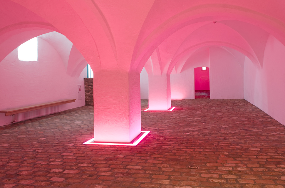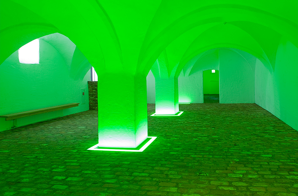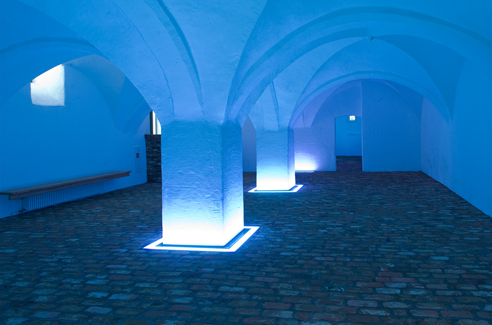 Die umlaufende Beleuchtung der Gewölbepfeiler im Fußbereich gibt dem Gesamten eine Leichtigkeit. Seine wechselnden Farben schaffen verschiedene Stimmungen für unterschiedliche Nutzungen.